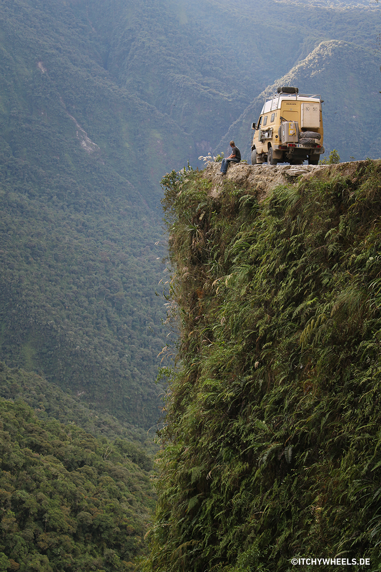 Irgendwann waren wir dann raus aus dem Moloch und mussten feststellen, dass wir kein einziges Foto gemacht hatten! Die neue Straße nach „Coroico“ ist schön breit und mit einem glatten, schwarzen Belag versehen. Aber wer will denn das schon fahren? Auf halbem Weg kann man von der Straße abfahren auf die „El camino de la muerte“ – Die Straße des Todes! Die ehemals gefährlichste Straße der Welt – solange, bis die neue Umgehungsstraße gebaut wurde. Heute fahren nur noch Radtouren und Touristen diese alte unbefestigte Route. Wir stiegen also ein. Eng an den Berg geschmiegt führte der Weg durch immer dichter werdenden Dschungel. Unglaubliche Ausblicke boten sich und wir fanden die Straße echt spektakulär und wunderschön. Die Gefährlichkeit wurde allerdings durch Leitplanken größtenteils entschärft. Allerdings stehen noch 100te von alten Kreuzen am Wegesrand und auch heute noch verlieren jedes Jahr Radfahrer ihr Leben auf der Todesstraße. Spät kamen wir dann in „Coroico“ an und fanden einen ruhigen Stellplatz oberhalb des kleinen Örtchens. Am nächsten Tag war Markttag und es war brutal voll. Rini wartete mit Zora in der brütenden Hitze vor der Markthalle und ich brachte alle fünf Minuten neue Tüten nach draußen und stellte sie bei ihr ab.