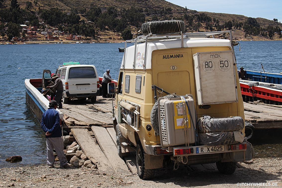Kurz darauf rollten wir schon in „Copacabana“ ein – nein nicht das am Zuckerhut – sondern das am Titicacasee. An der Uferpromenade, der bei Touristen so beliebten Kleinstadt, konnten wir super stehen und gaben unser letztes Peru-Geld an einem Essensstand für gebratene Forelle aus. Leider erfuhren wir von Einheimischen, dass die einzige Straße nach „La Paz“ derzeit gesperrt sei – wegen Protesten. Oh je! Drei Wochen vor unserer Einreise wurde der stellvertretende Innenminister von Bolivien bei Schlichtungsverhandlungen mit streikenden Bergarbeitern erschlagen. „Na mal sehen …“ dachten wir, was das so wird. Am Markt konnten wir super günstig einkaufen und es gab wieder lecker Ceviche. Drei Tage verbrachten wir in dem herrlichen Örtchen, dann war die Blockade beendet und die Straße angeblich wieder frei. Auf nach „La Paz“ hieß es für uns! Erst mussten wir noch ein kleines Stück auf einer abenteuerlichen Fähre über den Titicacasee gondeln, um dann auf einer nicht enden wollenden Baustelle Richtung der höchstgelegenen Hauptstadt der Welt zu gelangen.