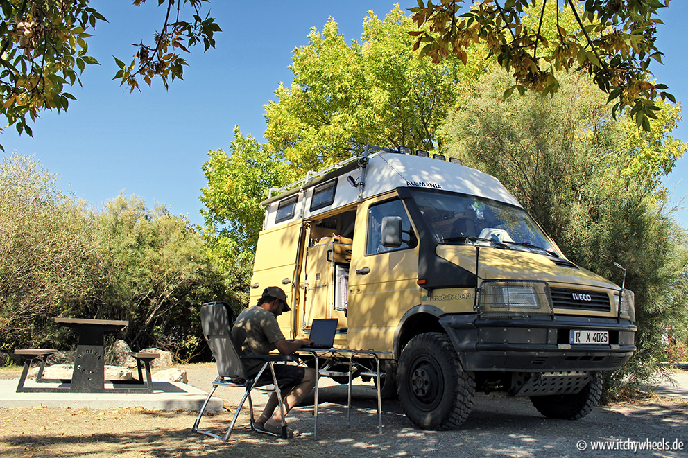 Abends fuhren wir mit unserem Abendessen im Rucksack noch einmal in den Park, um den Sonnenuntergang zu beobachten. In der folgenden Nacht hieß es dann für uns nicht Schäfchen zählen, sondern Mäuse zählen – unsere Falle funktionierte hervorragend – bei Maus Nr. 10 !!! haben wir aufgehört zu zählen, geschlafen haben wir in der Nacht so gut wie gar nicht. Wir hatten wohl auf einem Mäusenest geparkt und pünktlich zum Sonnenuntergang kamen die Bewohner irgendwo durch einen Holm ins Innere … Am Morgen war der Spuk vorbei und wir fix und fertig. Die Eigenbau-Falle heben wir mal lieber auf!