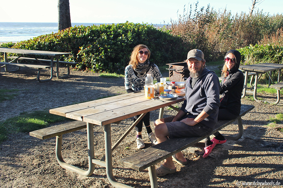 Ein paar Tage waren noch Zeit und wir beschlossen an die Küste zu fahren – waren ja nur 120 Kilometer. Leider war mal wieder Wochenende und der von uns favorisierte Campground „Cape Lookout“ voll. Ein paar Kilometer weiter, im gleichnamigen State Park, unternahmen wir noch eine 8 Kilometer-Wanderung auf die Spitze der Landzunge und sahen einen Grauwal vorbeiziehen. Leider war die Kamera nicht so schnell griffbereit …