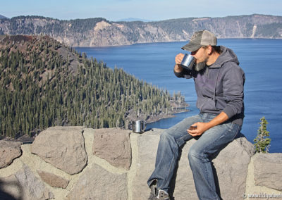 Unser Weg führte uns dann von der Küste weg, über Roseburg, zum „Crater Lake NP“. In Roseburg kamen wir nachmittags an und mussten mit Schrecken erfahren, dass es an diesem Morgen am College der 22.000 Einwohner zählenden Stadt, einen Amoklauf mit mind. 13 Toten gab. Erschüttert über diese Info fuhren wir weiter mit der Gewissheit, dass sich auch nach diesem tragischen Vorfall nichts an den Waffengesetzten in diesem Land ändern wird. Im „Umpqua National Forest“ fuhren wir zu den gleichnamigen „Hot Springs“ – auf einer Gravel Road ging es tief in den Wald und als wir an dem Parkplatz ankamen, mussten wir noch 1200 „Fuß“ auf den Berg laufen. Die Hot Springs entpuppten sich als eine heiße Quelle, die sich über Terrassen, mit 1-2 Personen fassenden Becken, in den Umpqua River ergießt – Wir waren ganz alleine, also lag es nahe ein morgendliches Bad zu nehmen 😉
